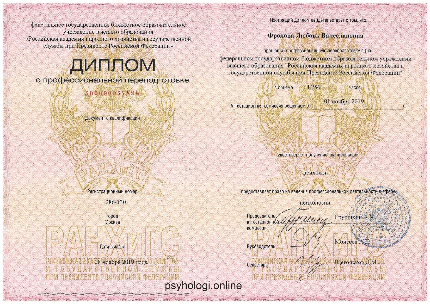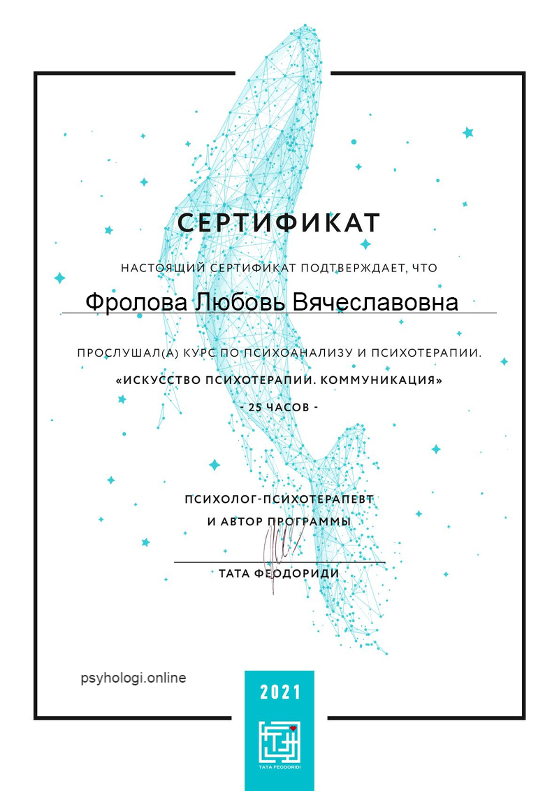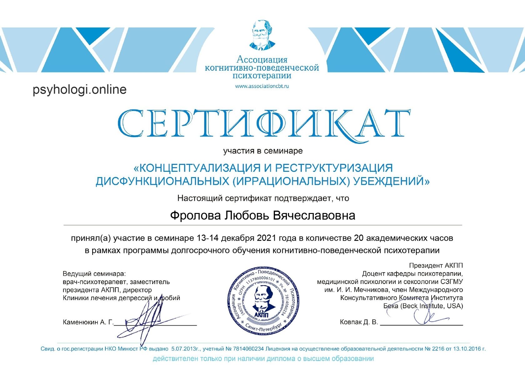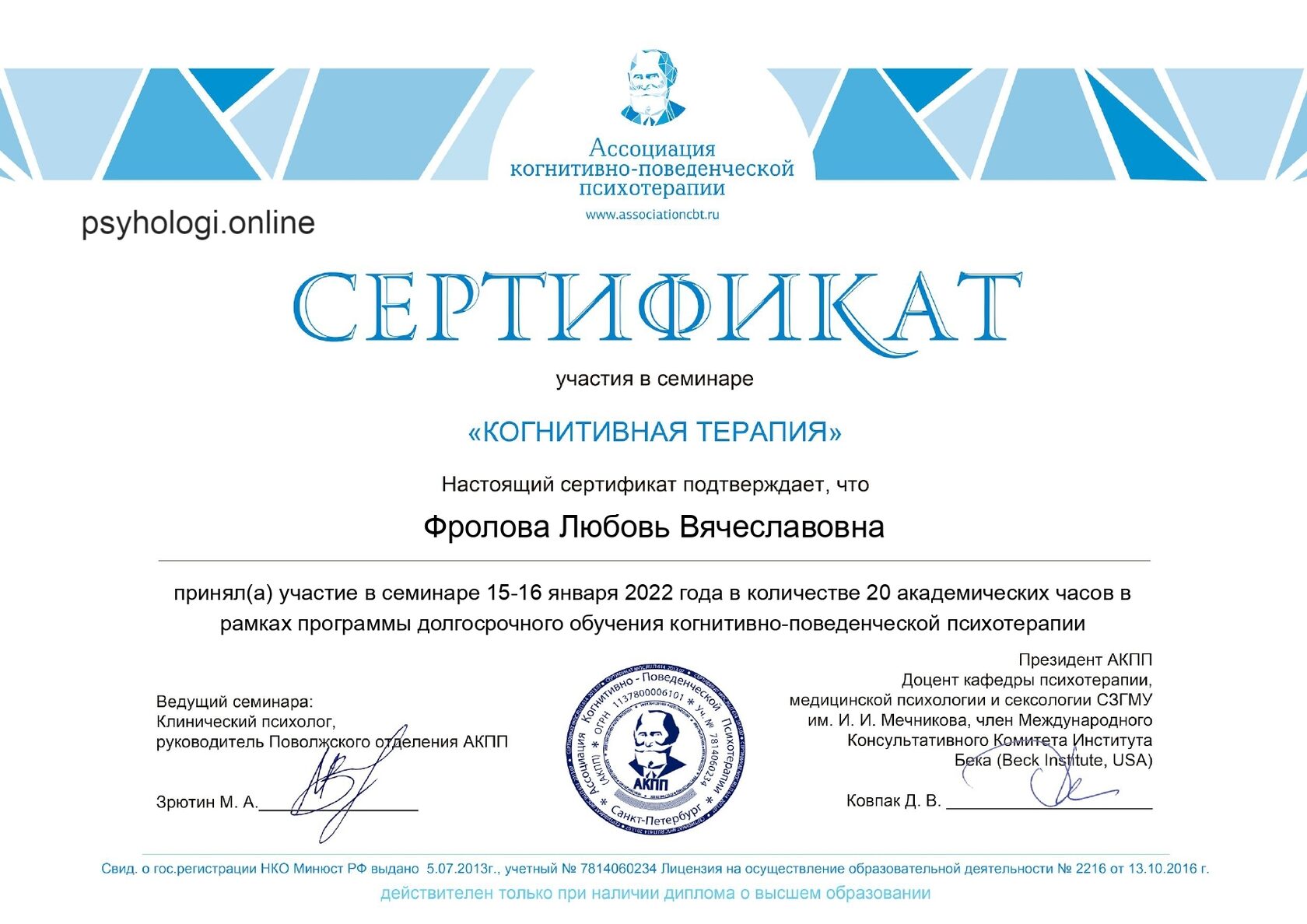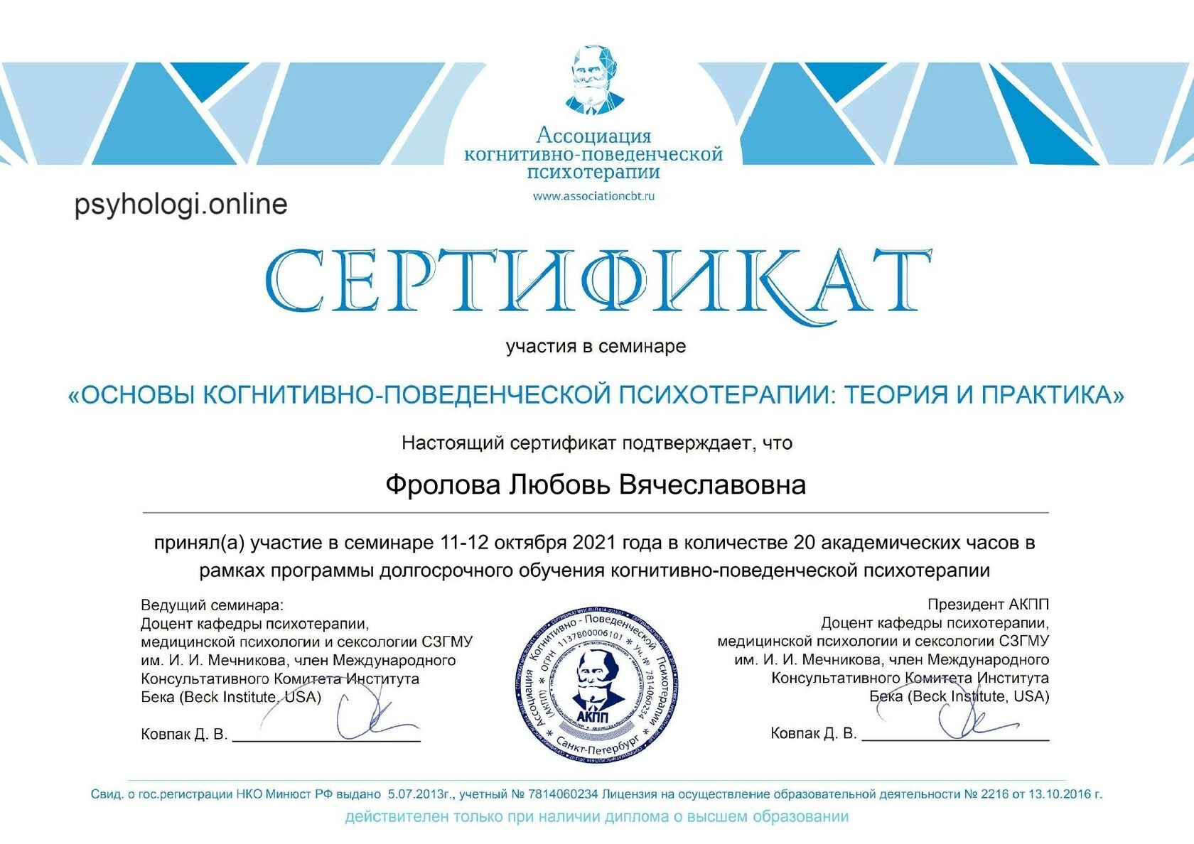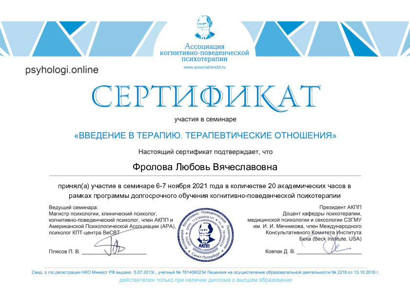 Повышение квалификации: Когнитивно - поведенческий терапевт. (под руководством канд. мед. наук, вице-президента Российской Психотерапевтической Ассоциации - Д.В. Ковпака)