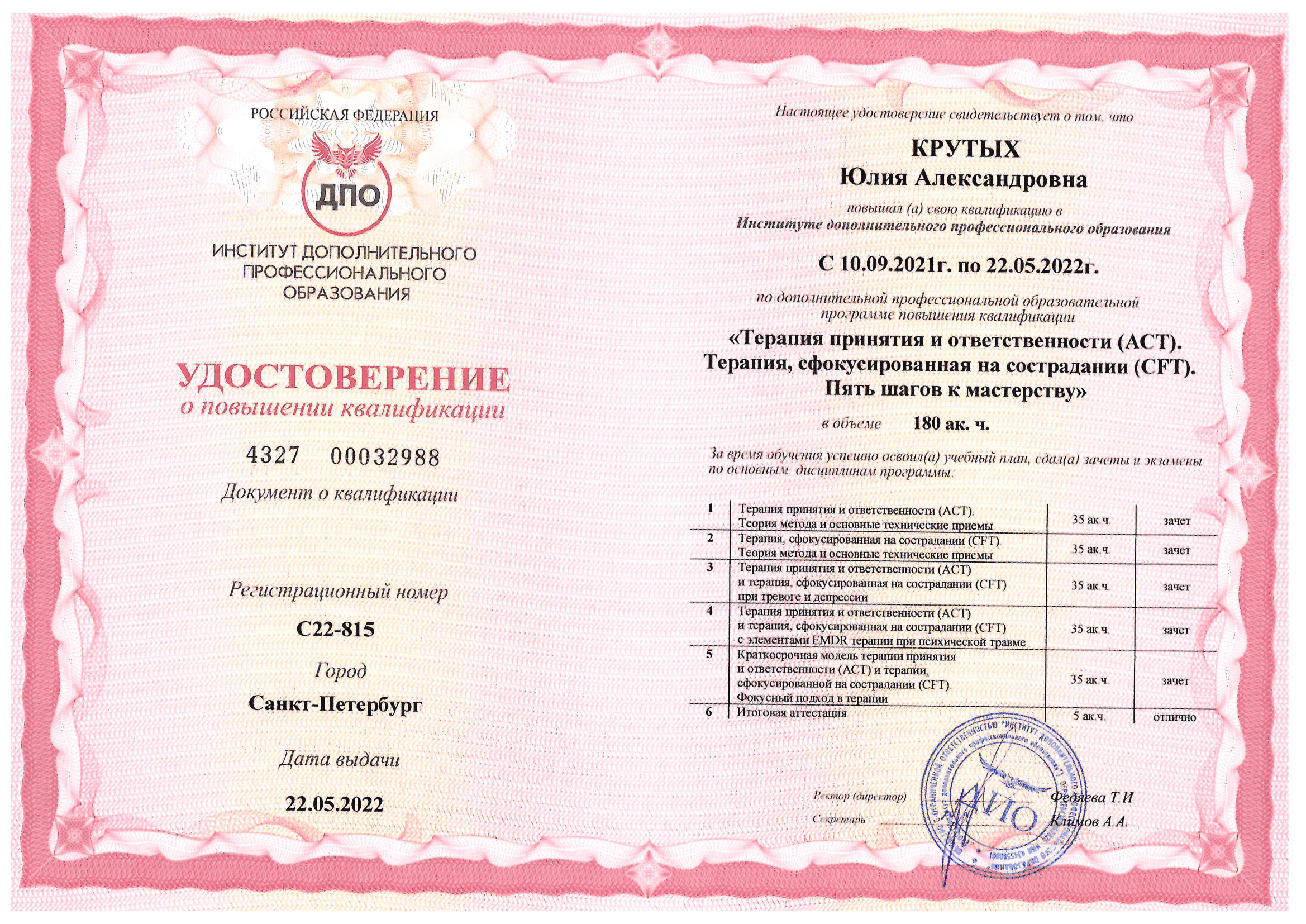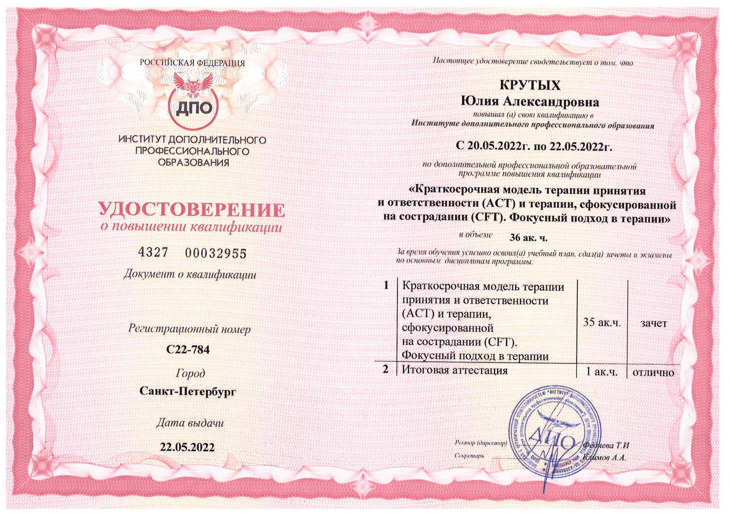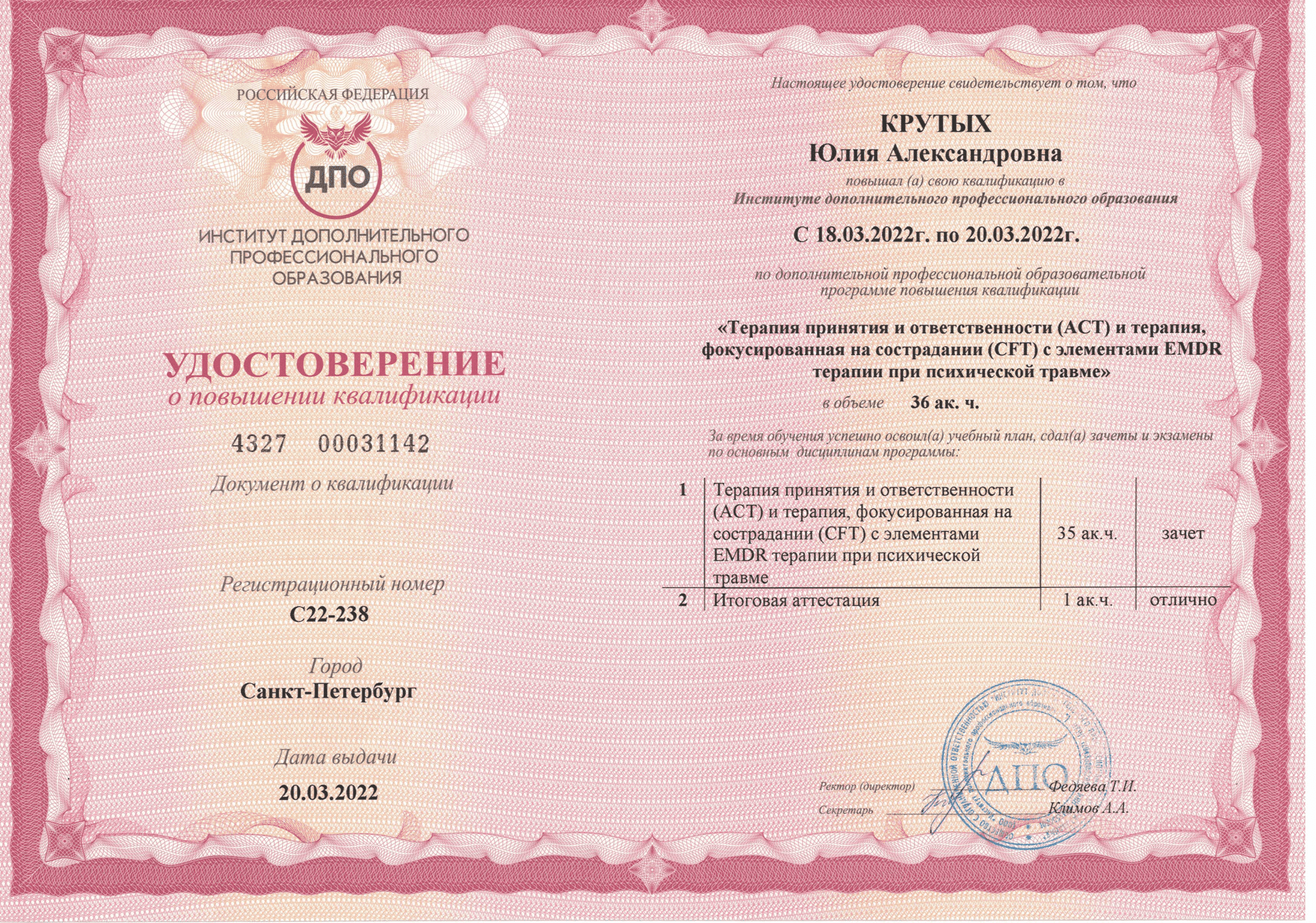 Терапия принятия и ответственности (АСТ). Терапия, сфокусированная на сострадании (СFT) с элементами EMDR терапии при психической травме, 36 ч.