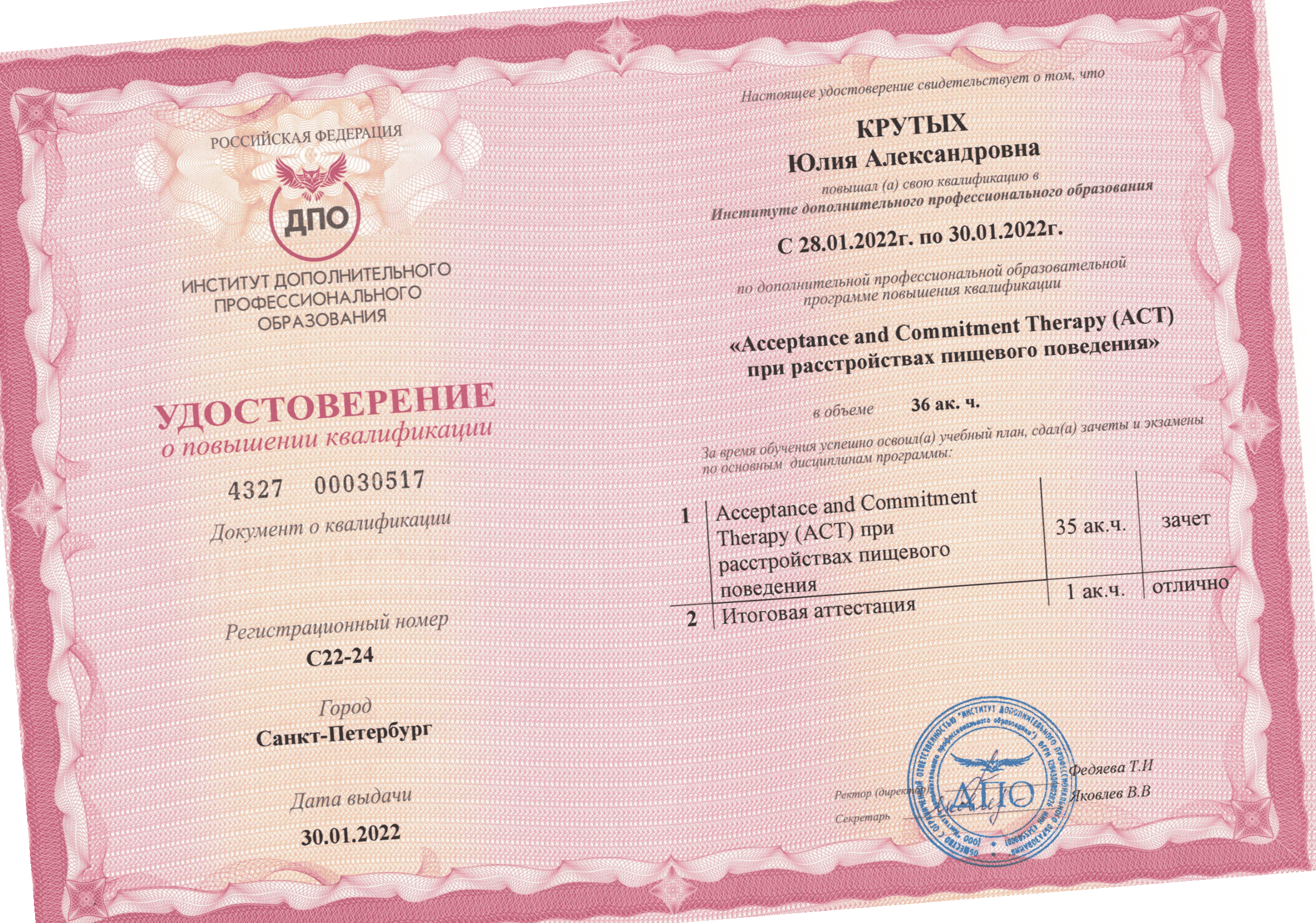 Acceptance and Commitment Therapy (ACT) при расстройствах пищевого поведения, 36 ч.