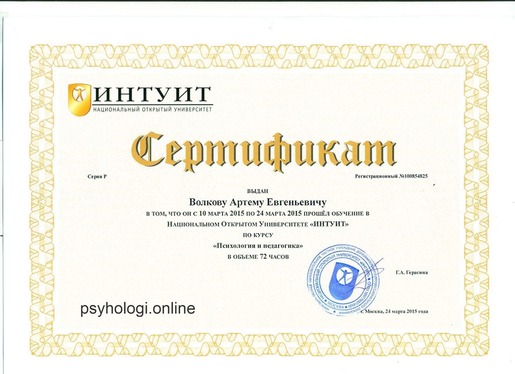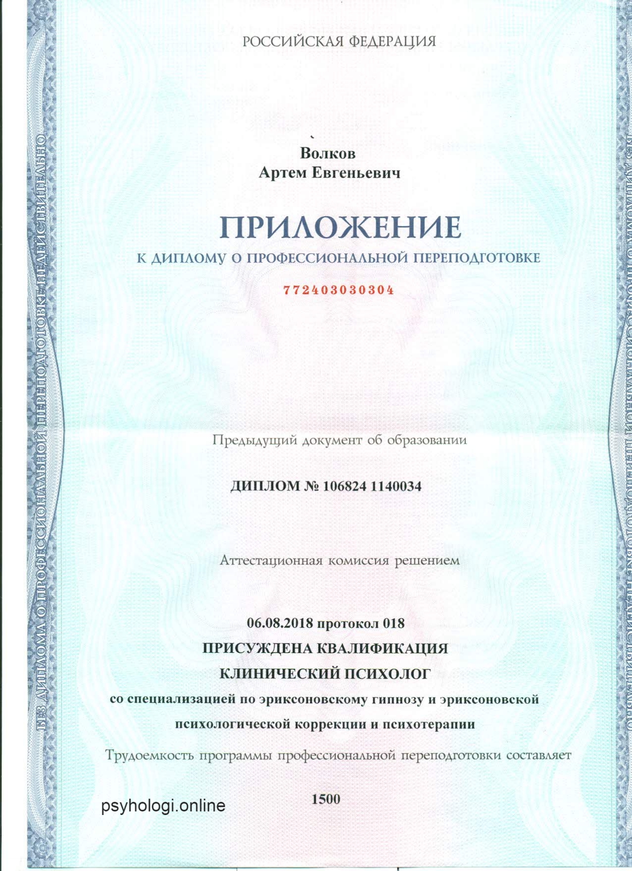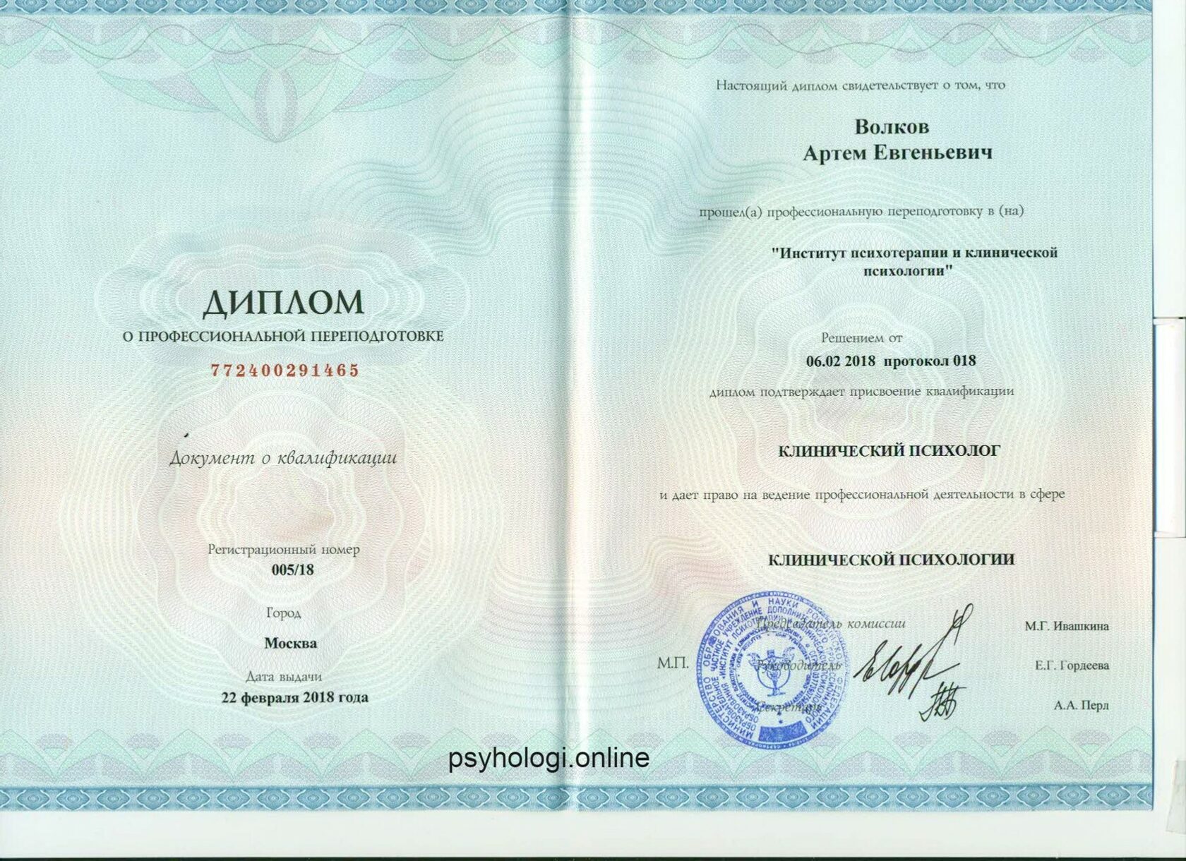 Специальность: Клинический психолог Квалификация: Клинический психолог со специализацией по эриксоновскому гипнозу и эриксоновской психологической коррекции и психотерапии.