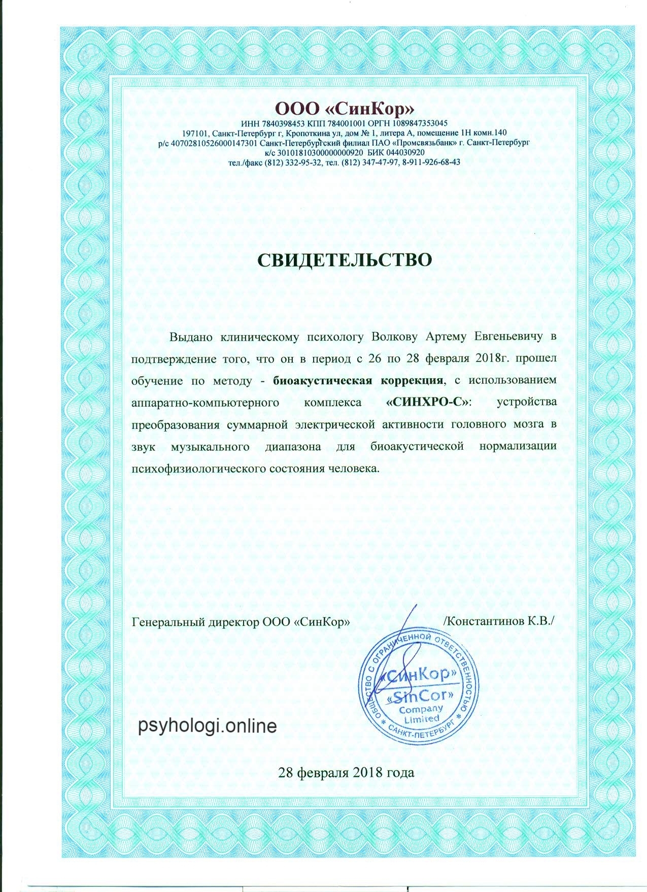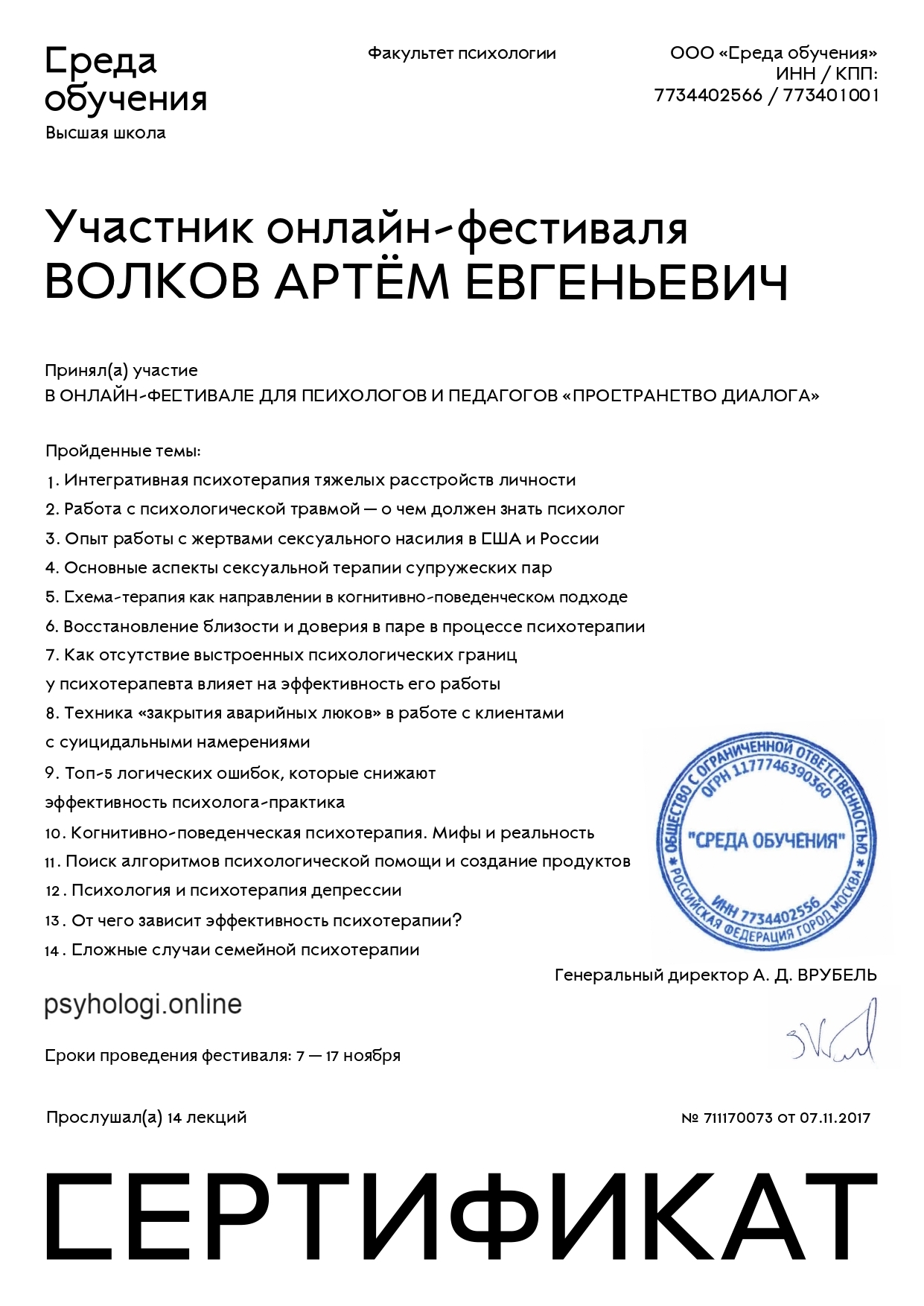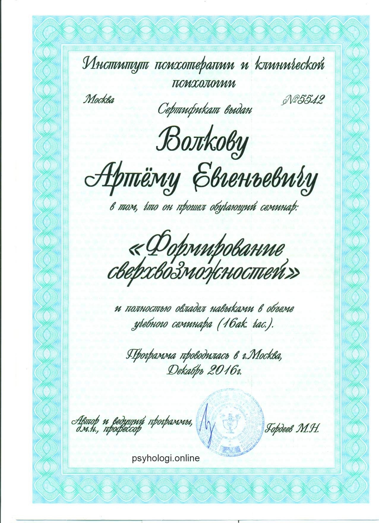 Я практикующий клинический психолог. Окончил Тамбовский государственный университет им. Г. Р. Державина по специализации общая психология. В 2018 году получил диплом о повышении квалификации в Московском институте психотерапии и клинической психологии по специальности клинический психологии специализацией: эриксоновский гипноз, эриксоновская психологическая коррекция и психотерапия.